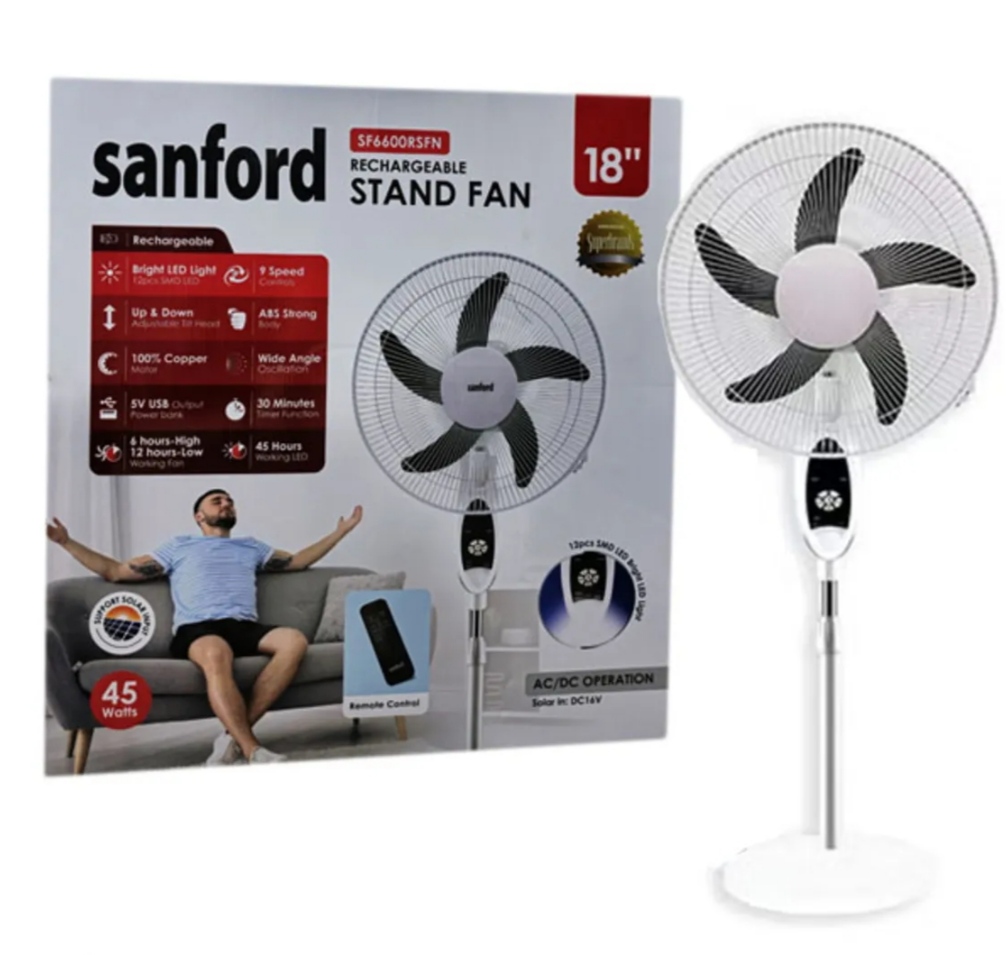 پنکه ایستاده شارژی و برقی سانفورد با موتور قدرتمند 9 سرعته و 5 پره و دارای ریموت کنترل و چراغ روشنایی و پاور بانک با قابلیت شارژ و استفاده از انرژی خورشیدی(سولار) با کارکرد 12 ساعت بدون برق با قابلیت تنظیم ارتفاع با کیفیت عالی و طراحی زیبا