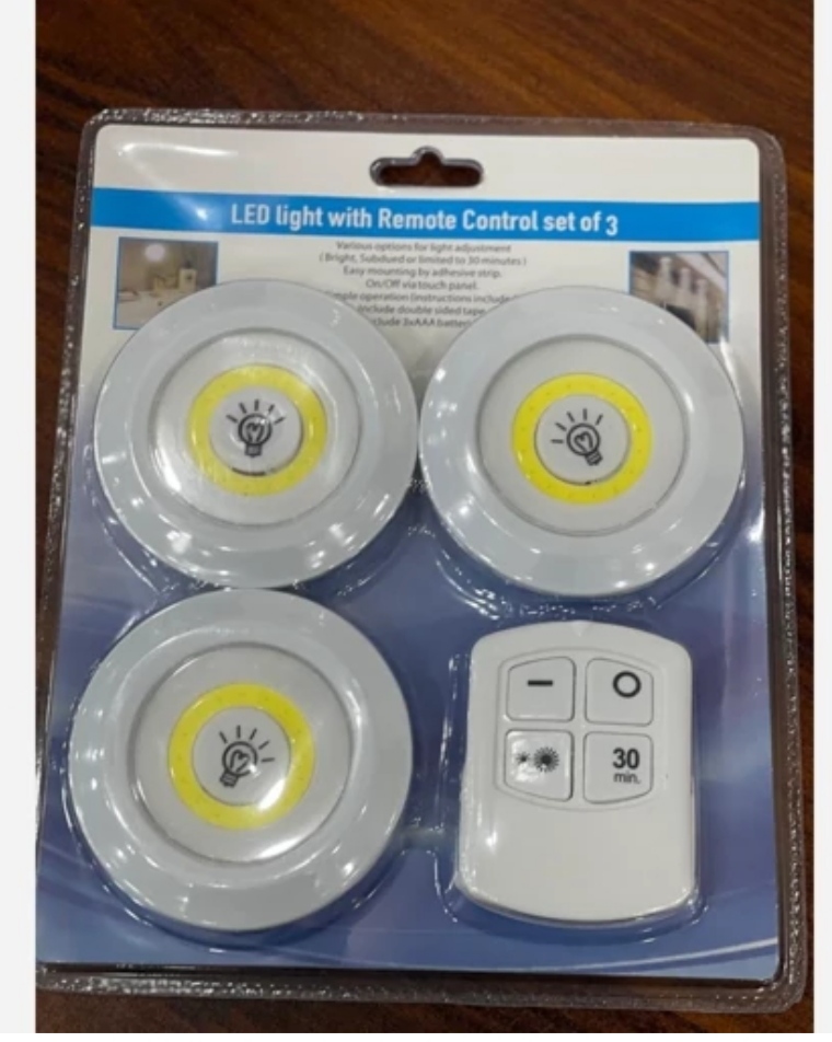 این محصول شامل سه چراغ LED و یک ریموت کنترل است.